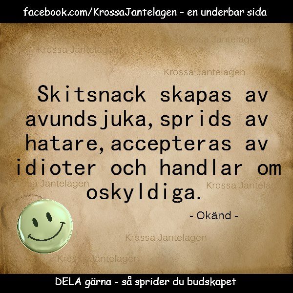 Vi pratar om att stötta våra barn och ge dem en bra grund med bra självkänsla. Ja, det är exakt det jag själv pratar om, men sedan kommer jante och sveper in över samhället och krossar drömmarna vi lagt år på att bygga upp… Och vi som vuxna, vad håller vi på med? Förtalar, snackar skit och sänker dem som lyckas, dem som vill något annorlunda eller dem som inte ser ut som du! Vi hånar dem som är stolta över sig själva och som lyckats bibehålla den där självkänslan som våra föräldrar eller vuxna byggt upp från början. VEM FAN TROR DU ATT DU ÄR??? Var normal! Tyck inte, andas inte, se inte ens ut!